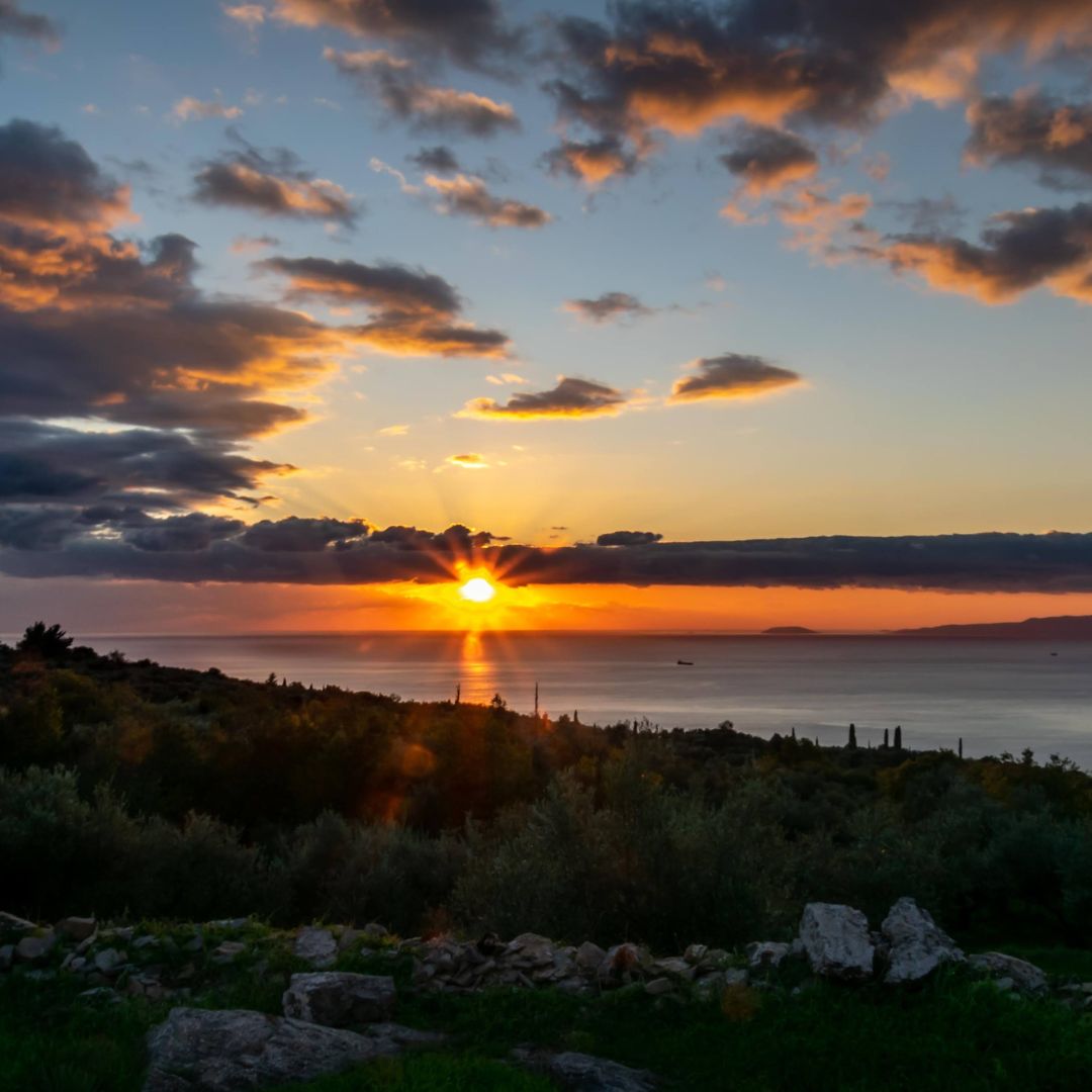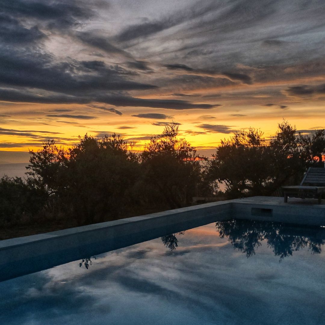 Uczucie „powrotu do domu” rosło i wzmacniało się, nawet jeśli wspaniały, swobodny widok musiał być ograniczony płotem i murem. Nie dlatego, że baliśmy się złodziei, ale dlatego, że zwierzęta zjadały wszystko, co wyhodowaliśmy! No cóż, w końcu żyjemy w „dzikim Mani”, haha. Zrobiło się nas więcej w domu, wprowadziła się Estia, było mniej wizyt na plaży, ponieważ basen kusił chłodzącymi kąpielami a nasz własny gaj oliwny przyjemnym cieniem i ciszą. Choć wieczorami coraz dłużej musiałam pracować, luksusem było być na tarasie i podziwiać wspaniałe zachody słońca.
