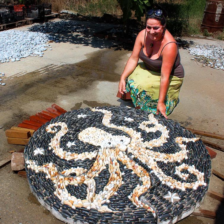DC: Postanowiłam opuścić rodzinny biznes i wychowywać córkę na pełny etat. Jestem artystą mozaiki i samoukiem. Badałam techniki i zacząłam tworzyć mozaiki w starożytny sposób, ale pracuję również z innymi materiałami, aby tworzyć mozaiki w stylu współczesnym. W 2017 roku otworzyłam firmę MOSAIC ART GREECE, która obejmuje mozaiki z kamyków na dużą skalę, mozaikę dekoracyjną i biżuterię. Przyjmuję zlecenia i większość moich prac jest dostępna online lub w moim studio w Sparcie. Prowadzę również 3-godzinne warsztaty dla każdego, kto jest zainteresowany poznaniem podstaw tej starożytnej formy sztuki. Zapraszam do sprawdzania mojej strony internetowej , Facebooka lub mojego Instagrama .
